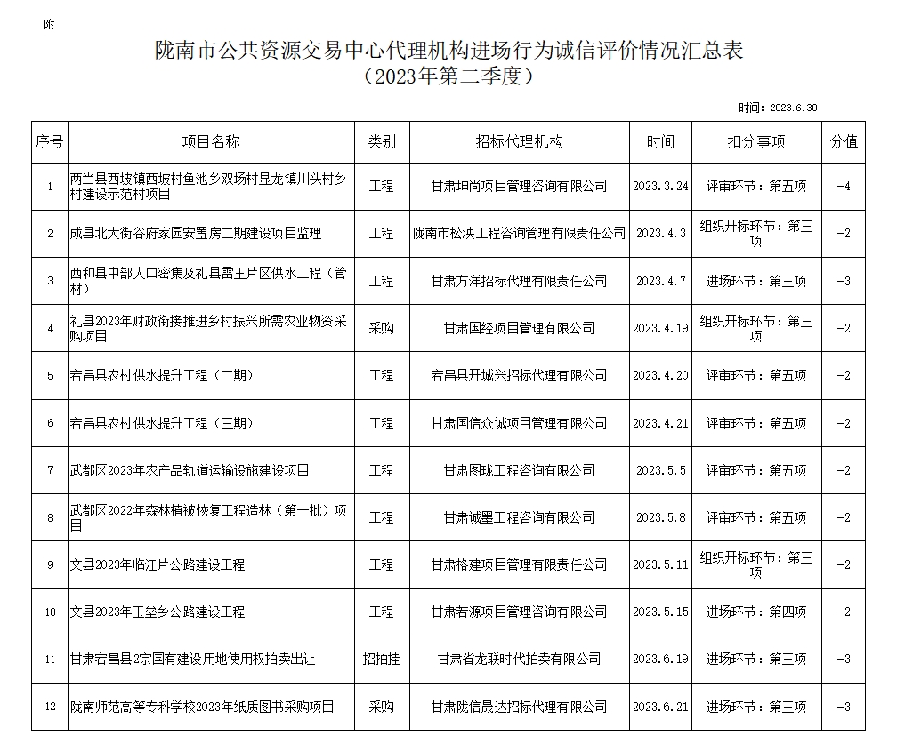 根據(jù)《甘肅省公共資源交易代理機構管理辦法》(甘政辦發(fā)〔2019〕107號)和《隴南市公共資源交易中心代理機構進場行為誠信評價實施制度(試行)》規(guī)定,現(xiàn)對2023年第二季度,共12家代理機構12條進場行為誠信評價記錄予以通報(詳見附表)。請各代理機構嚴格遵守各項規(guī)章制度、誠實守信,規(guī)范操作,為招標人和采購人提供專業(yè)、高效、規(guī)范的招標代理服務。