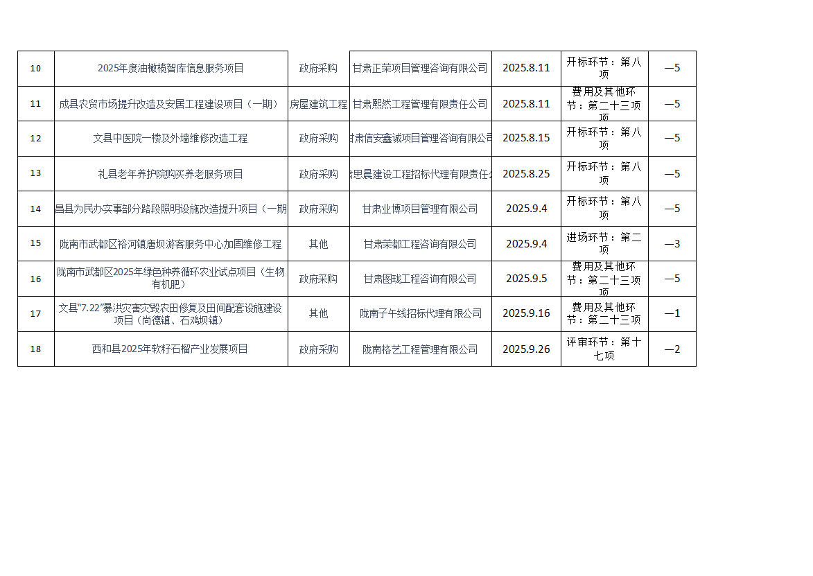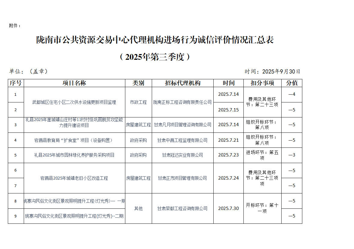 根據(jù)《隴南市公共資源交易中心代理機構(gòu)進場行為誠信評價實施制度(試行)》規(guī)定,現(xiàn)對2025年第三季度共15家代理機構(gòu)18條進場行為誠信評價記錄予以通報(詳見附表)。請各代理機構(gòu)嚴(yán)格遵守各項規(guī)章制度、誠實守信,規(guī)范操作,為招標(biāo)人和采購人提供專業(yè)、高效、規(guī)范的招標(biāo)代理服務(wù)。