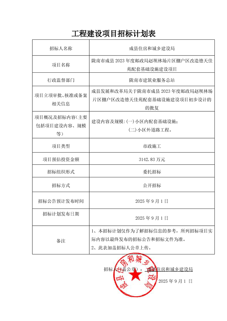 隴南市成縣2023年度郵政局趙壩林場(chǎng)片區(qū)棚戶區(qū)改造德天佳苑配套基礎(chǔ)設(shè)施建設(shè)項(xiàng)目