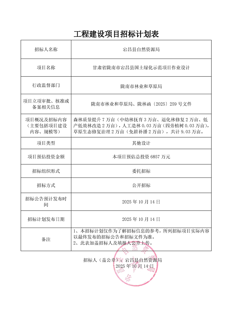 工程建設項目招標計劃表甘肅省隴南市宕昌縣國土綠化示范項目作業(yè)設計.pdf