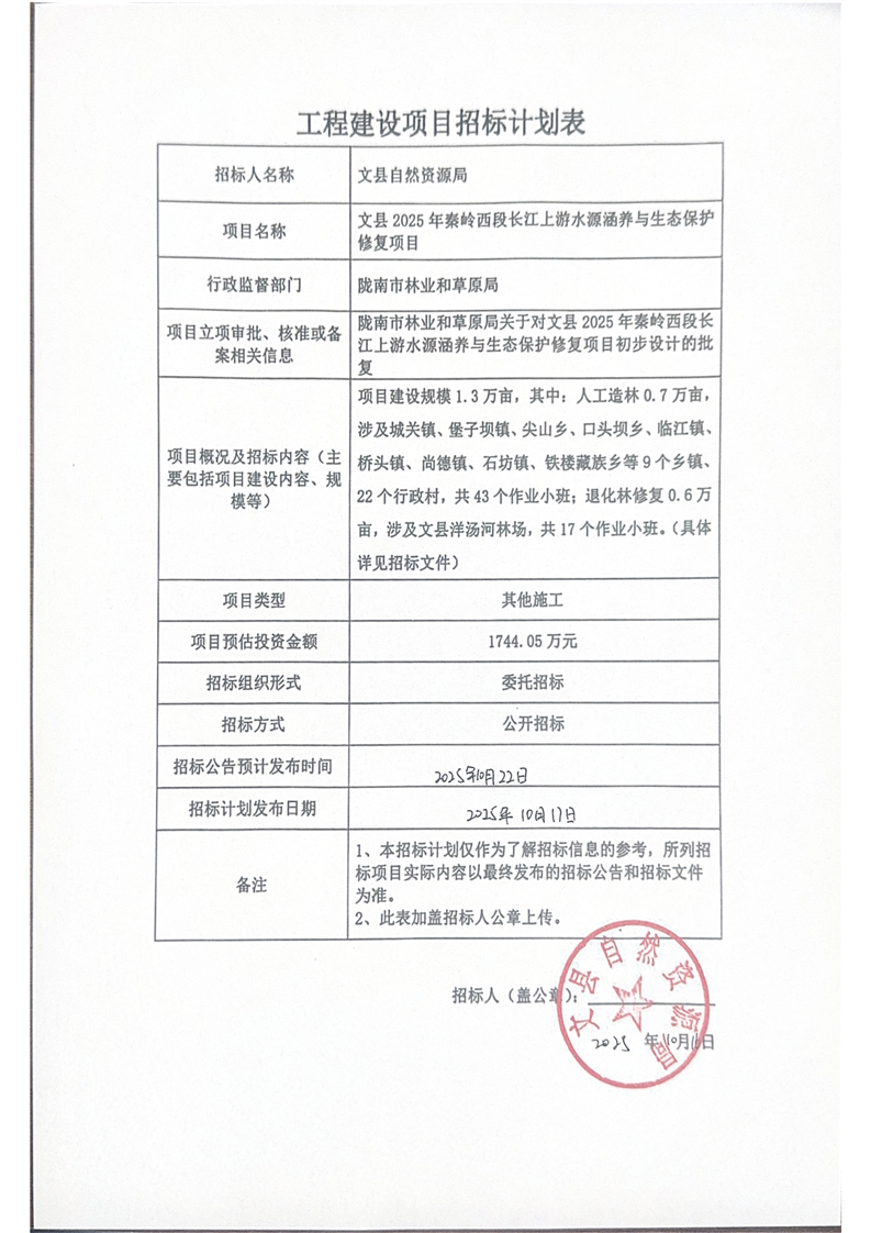 文縣2025年秦嶺西段長(zhǎng)江上游水源涵養(yǎng)與生態(tài)保護(hù)修復(fù)項(xiàng)目