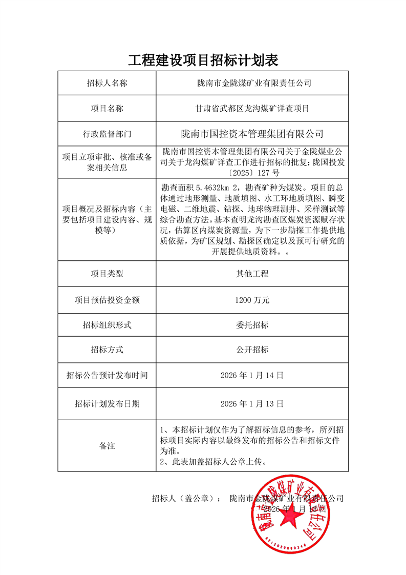 甘肅省武都區(qū)龍溝煤礦詳查項(xiàng)目