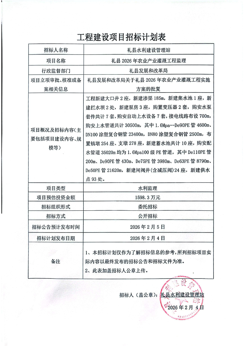 禮縣2026年農(nóng)業(yè)產(chǎn)業(yè)灌溉工程監(jiān)理