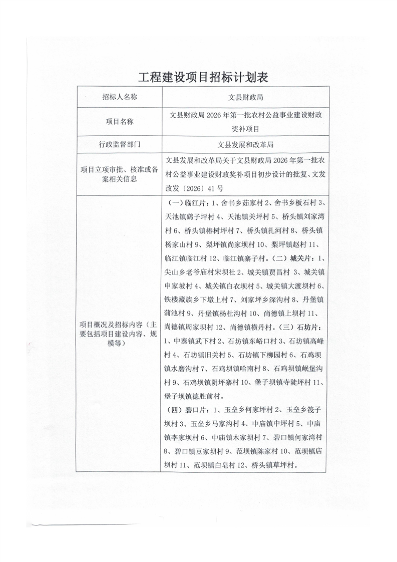 文縣財政局2026年第一批農(nóng)村公益事業(yè)建設(shè)財政獎補(bǔ)項(xiàng)目