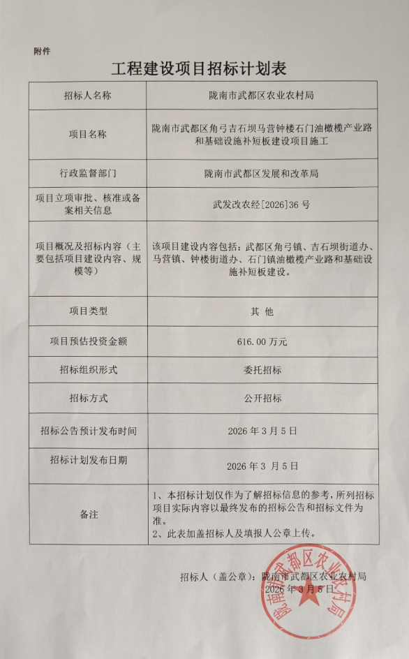 隴南市武都區(qū)角弓吉石壩馬營鐘樓石門油橄欖產(chǎn)業(yè)路和基礎(chǔ)設(shè)施補(bǔ)短板建設(shè)項(xiàng)目