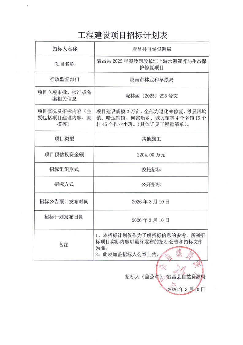 宕昌縣2025年秦嶺西段長江上游水源涵養(yǎng)與生態(tài)保護修復(fù)項目