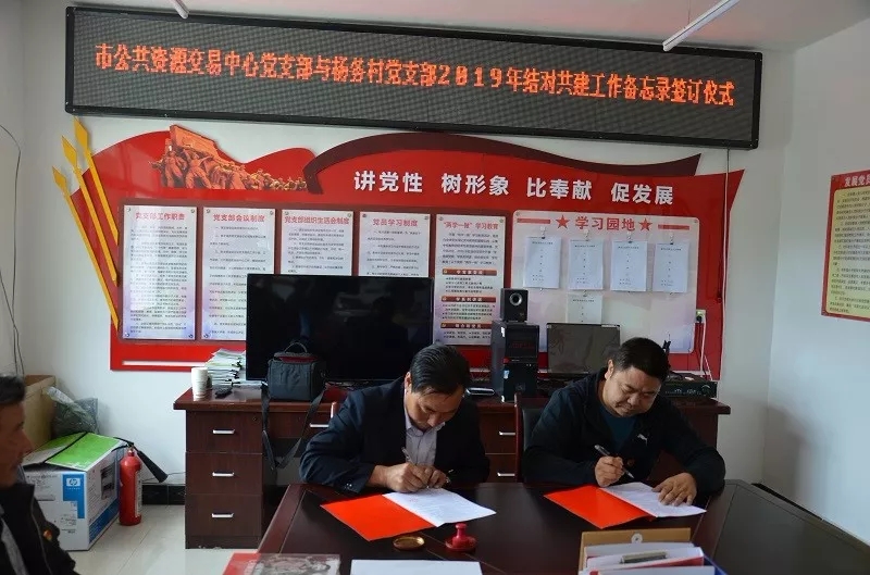 根據(jù)《中共隴南市委組織部關(guān)于扎實(shí)做好幫扶單位黨組織與貧困村黨組織結(jié)對攻堅(jiān)工作的通知》要求,市公共資源交易中心黨支部與武都區(qū)黃坪鎮(zhèn)楊務(wù)村黨支部在4月啟動開展結(jié)對共建活動基礎(chǔ)上,組織召開雙方黨支部結(jié)對共建工作聯(lián)席會,進(jìn)一步探討和完善結(jié)對共建方案,簽訂了《隴南市公共資源交易中心黨支部與武都區(qū)黃坪鎮(zhèn)楊務(wù)村黨支部2019年結(jié)對共建工作備忘錄》。
